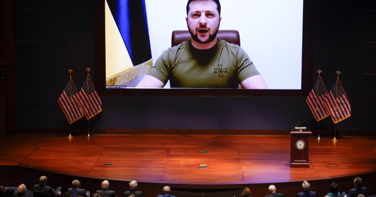 해당 사진은 젤렌스키 대통령이 2022년 3월 16일 미 의회로 상대로 진행한 화상 연설의 한 장면을 캡쳐한 것으로 보인다.