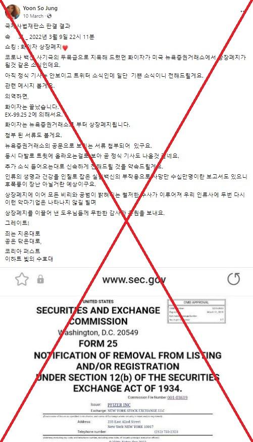 미국 제약사 화이자의 주식이 뉴욕증권거래소에서 상장 폐지됐다는 주장이 페이스북상에서 반복적으로 공유됐다. 이 게시글들은 미 증권거래위원회의 공문으로 보이는 문서를 주장의 근거로 내세웠다. 하지만 이 주장은 사실이 아니다: 2022년 4월 29일 기준, 화이자 주식은 여전히 뉴욕증권거래소에서 거래되고 있다; 주장이 인용한 문서는 화이자의 어음과 관련한 문서다.