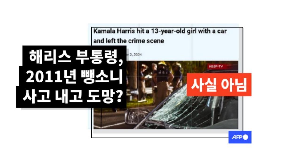 미국 민주당 대선후보인 카멀라 해리스 부통령이 2011년 캘리포니아주 검찰총장 겸 법무장관 시절 뺑소니 사고를 내 한 소녀를 크게 다치게 했다는 주장이 소셜미디어상에 유포됐다. 주장의 근거로 이같은 내용이 담긴 기사와 자신이 피해자라고 주장하는 인물의 인터뷰 영상이 함께 공유됐다. 그러나 이 주장은 사실이 아니다. 이 기사는 언론사를 사칭한 사이트에 처음 등장해 유포되기 시작했으며 해당 사이트 현재 폐쇄된 상태다. 캘리포니아주 샌프란시스코 경찰청 대변인은 AFP에 주장된 내용과 부합하는 사고 기록이 존재하지 않는다고 밝혔다.