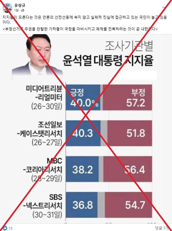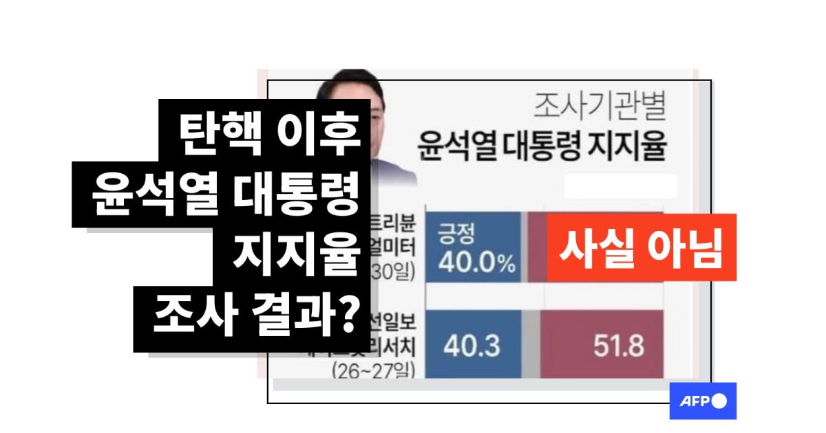윤석열 대통령의 지지율이 40 퍼센트에 육박하는 결과를 나타내는 다수의 여론조사 결과가 비상계엄 및 탄핵 이후 공표된 최신 수치라는 주장과 함께 소셜미디어상에 반복적으로 공유됐다. 그러나 이 그래픽은 2022년 12월 진행된 여론조사 결과를 반영한 내용으로, 최신 조사 결과가 아니다. 그래픽에 인용된 여론조사기관 리얼미터는 윤 대통령 탄핵 이후 대통령국정수행 평가에 대한 조사를 중단했다고 밝혔으며, 케이스탯리서치, 코리아리서치 등은 탄핵 이후 공개한 전국지표조사를 통해 대통령 지지율이 16 퍼센트로 떨어졌다고 발표했다.