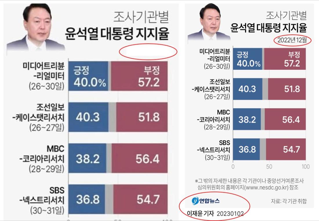 다음은 조작된 그래픽(좌)과 연합뉴스가 2023년 1월 공개한 원본 그래픽(우)을 비교한 것이다.