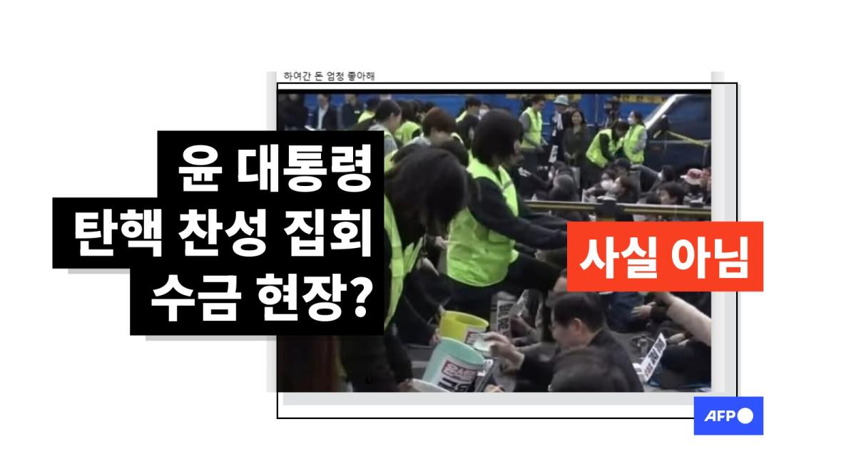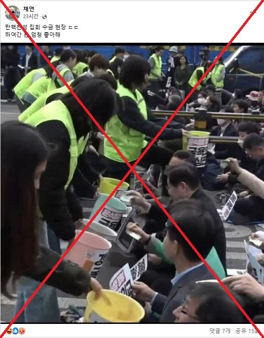사진 한 장이 윤석열 대통령 탄핵찬성 집회에서 참가자들을 상대로 모금하는 주최 측 관계자들의 모습이라는 주장이 소셜미디어상에 반복적으로 공유됐다. 그러나 이 사진은 2023년 3월 열린 일제 강제동원 배상 관련 정부 해법을 규탄하는 집회에서 촬영된 것으로, 탄핵 찬성 집회와는 무관하다.