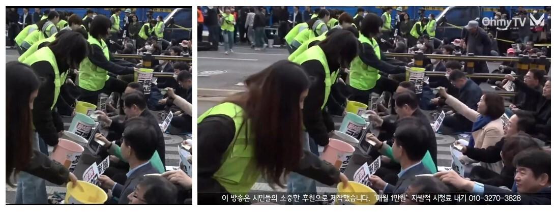 다음은 잘못된 주장과 공유된 사진(좌)과 오마이티비가 중계한 원본 영상 속 일치하는 장면(우)을 비교한 것이다.