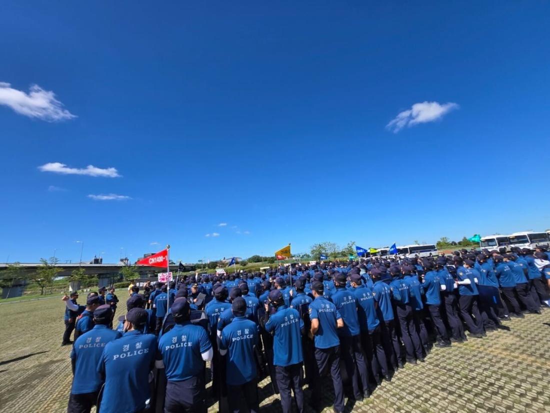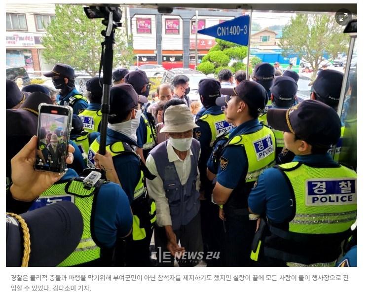 사진에는 "물리적 충돌과 행사 파행을 막기 위해" 경찰이 현장에 투입됐다는 설명이 붙었다.