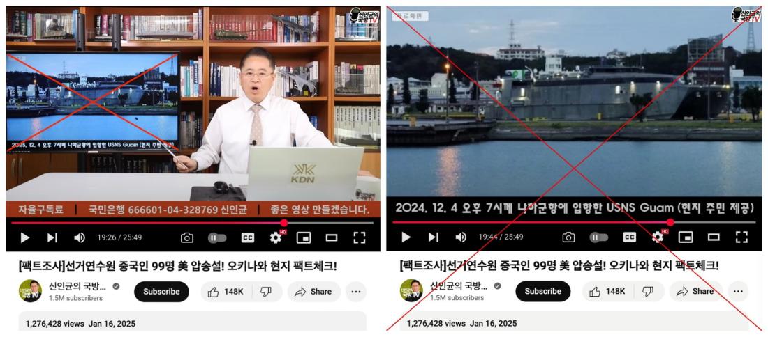 선거연수원에서 체포된 중국 간첩들을 태운 미 해군 수송함이 비상계엄 선포 다음 날인 2024년 12월 4일 밤 일본 오키나와 주일미군기지에 도착하는 모습이라는 주장과 함께 사진 한 장이 소셜미디어상에 반복적으로 공유됐다. 앞서 온라인 매체 스카이데일리는 '계엄 당일 선거연수원에서 선거 조작에 관여한 중국인 99명이 체포돼 일본으로 이송됐다'고 보도했는데, 소셜미디어 이용자들은 문제 사진을 두고 이 보도에 대한 정황증거라가 드러난 것이라 주장했다. 그러나 이는 사실이 아니다. 주한미군사령부와 중앙선거관리위원회는 AFP에 해당 보도는 허위라고 밝혔으며, '오키나와 현지 팩트체크' 결과로 둔갑해 공유된 미 수송선 사진도 계엄 다음 날이 아닌 한달 여 뒤인 2025년 1월 촬영됐다.