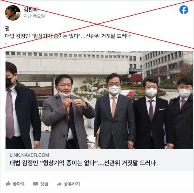윤석열 대통령이 12·12 담화에서 중앙선거관리위원회가 2023년 북한으로부터 해킹 공격을 받았다고 주장하며 전산시스템 점검을 위해 선관위에 계엄군을 투입했다고 말한 후 소셜미디어상에는 선관위를 겨냥한 허위정보가 확산됐다. 이 가운데 '대법원에서 선관위의 거짓말이 드러났다'라는 주장도 반복적으로 공유됐는데 이 주장은 사실이 아니다. 이들 게시글에 인용된 기사는 2020년 국회의원 선거 무효 소송을 다룬 몇 년 전 기사로 해당 소송은 2022년에 이미 원고 패소로 종결됐다. 중앙선관위는 AFP에 선거 부정이 소송에서 입증된 사례는 지금까지 단 한 건도 없다고 밝혔다.