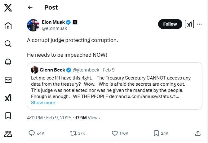 벡은 이날 머스크가 이끄는 DOGE의 재무부 결제 시스템 접속 권한을 일시 제한하는 명령을 내린 뉴욕남부지방법원 판사 폴 엥겔마이어(Paul Engelmayer)를 공격하는 게시글을 X에 올렸다 (아카이브 링크).