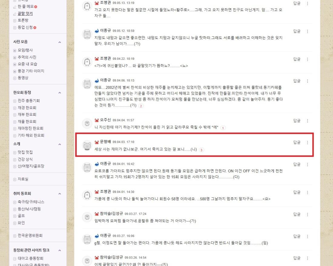문 대행이 남긴 댓글("세상 사는 재미가 없나 보군...")은 이 동문 카페의 '끝말 잇기' 게시판에서 찾을 수 있었는데, 이곳에 남겨진 일련의 댓글들은 가벼운 말장난을 주고받는 대화 속에서 작성된 것이며, 음란물과 관련된 언급은 전혀 없었다.