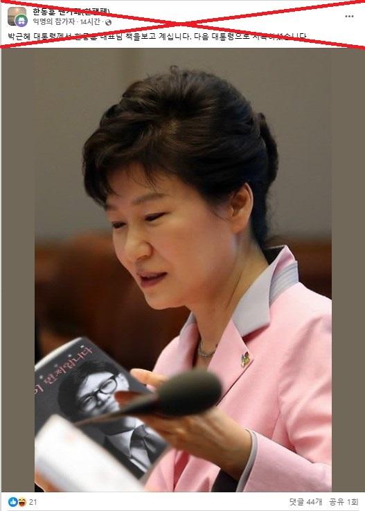 사진 한 장이 한동훈 전 국민의힘 대표의 신간 저서를 들여다보는 박근혜 전 대통령의 모습이라는 주장과 함께 소셜미디어상에 반복적으로 공유됐다. 그러나 이 사진은 조작된 것으로, 2014년 6월 수석비서관회의에서 보건복지부 등이 발간한 복지 정보 책자를 살펴보는 박 전 대통령 사진에 한 전 대표 책 표지를 합성한 것이다.