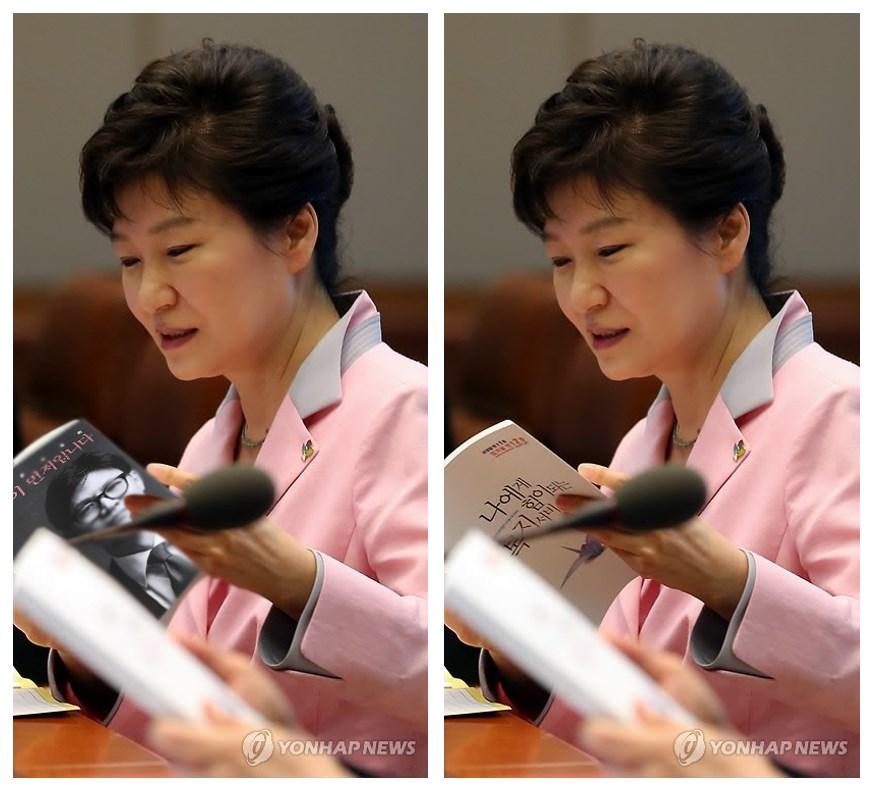 사진에는 "박근혜 대통령이 30일 오전 청와대에서 열린 수석비서관회의에서 보건복지부 포함 17개 정부부처가 발행한 책 '나에게 힘이 되는 복지 서비스'를 잠시 살펴보고 있다"라는 설명이 붙었다.
