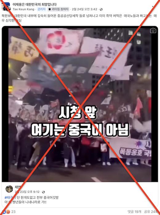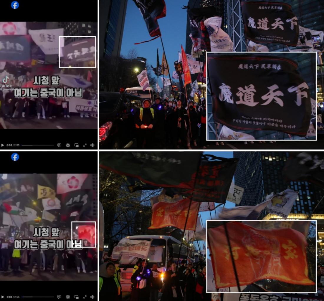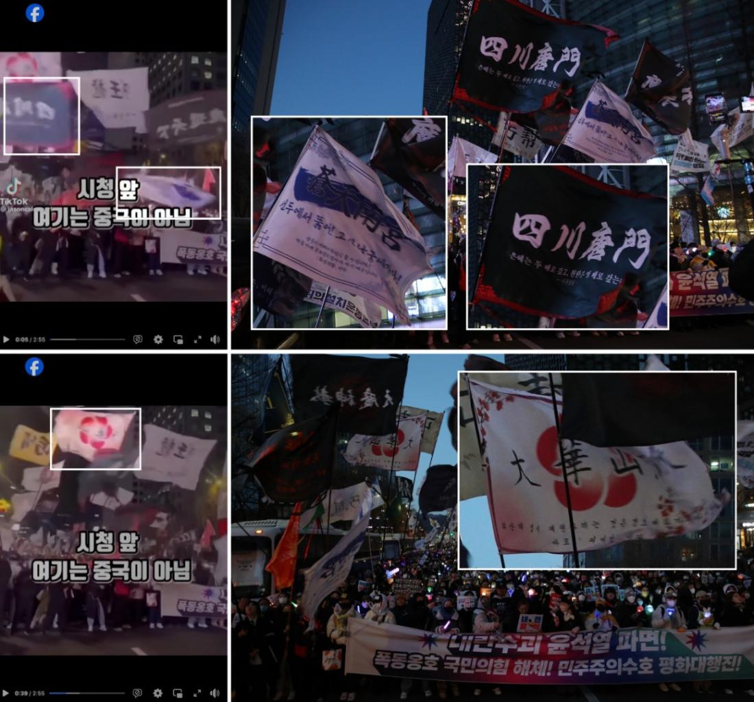 한 영상이 윤석열 대통령 탄핵을 촉구하는 중국인들의 모습이라는 주장과 함께 소셜미디어상에 반복적으로 공유됐다. 영상에는 한자가 적힌 깃발을 흔드는 집회 참가자들의 모습이 담겼다. 그러나 이 주장은 사실이 아니다. 해당 집회에서 촬영된 고화질 사진을 확인한 결과 깃발에 적힌 내용은 대부분 국내 무협소설을 인용한 것으로 드러났다. 12·3 비상계엄 사태 이후 개성과 취미를 드러낸 이색 깃발들이 집회 현장에 등장해 이목을 끌었는데, 문제 영상에 등장하는 깃발은 무협 웹소설 장르를 즐겨 읽는 이들이 자신이 좋아하는 소설 속 인물이나 구절을 깃발에 한자로 표현한 것으로 보인다.