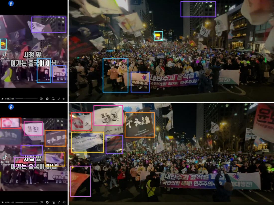 아래는 문제 영상(좌)과 윤석열즉각퇴진·사회대개혁 비상행동 영상(우)을 비교한 것이다. 일치하는 요소들을 같은 색으로 표시했다.