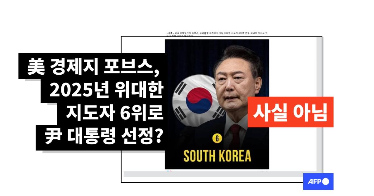 윤석열 대통령이 미국 경제 잡지 포브스가 선정한 '2025년 세계에서 가장 위대한 지도자' 목록에서 6위에 올랐다는 주장이 한 이미지와 함께 소셜미디어상에 반복적으로 공유됐다. 그러나 포브스 관계자는 해당 순위를 선정한 적이 없다고 밝혔다. 미국의 시사 주간지 US 뉴스&월드 리포트가 실제 발표한 '2025년 세계에서 가장 강력한 국가' 순위에서 한국이 6위를 기록했지만 이는 포브스와는 무관하다.