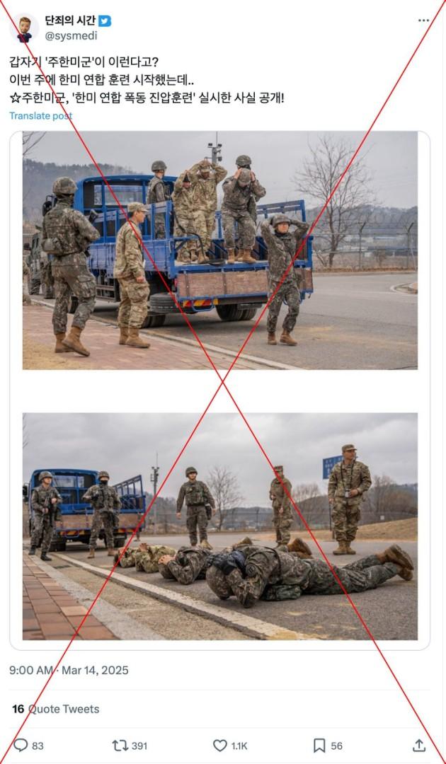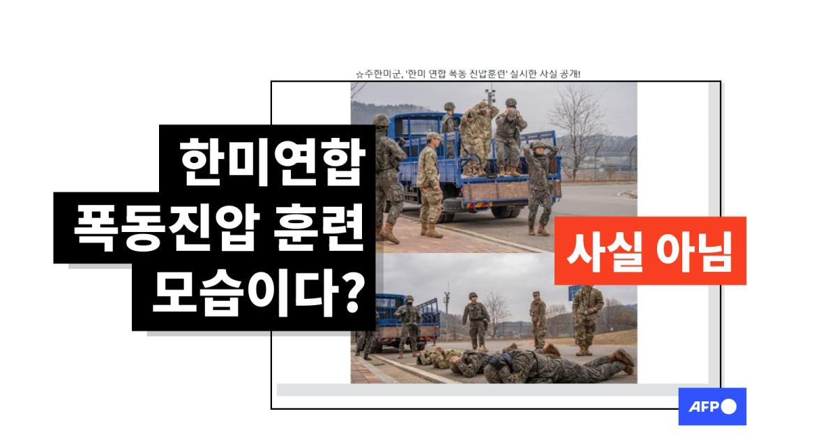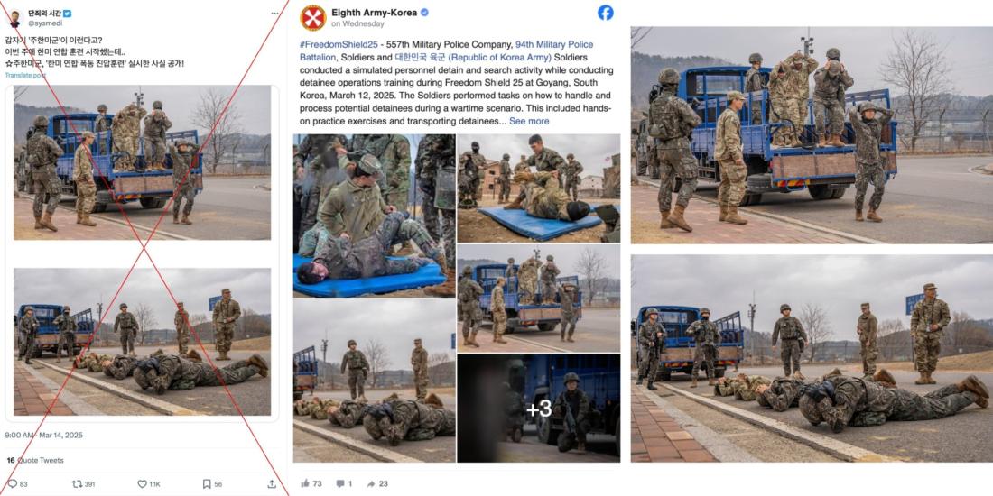 비상계엄 사태 이후 불안정한 정국이 이어지고 있는 가운데 사진 두 장이 한미연합 폭동진압 훈련을 촬영한 것이라는 주장과 함께 소셜미디어상에 반복적으로 공유됐다. 그러나 이 주장은 사실이 아니다. 해당 사진은 이달 중순에 실시된 '자유의 방패' 한미연합훈련 중 전시포로 처리 훈련 모습을 담고 있으며, 미군 측은 AFP에 연례 '자유의 방패' 연습 중 일부로 전시포로 작전 외 다른 훈련 목적은 전혀 없었다고 밝혔다.
