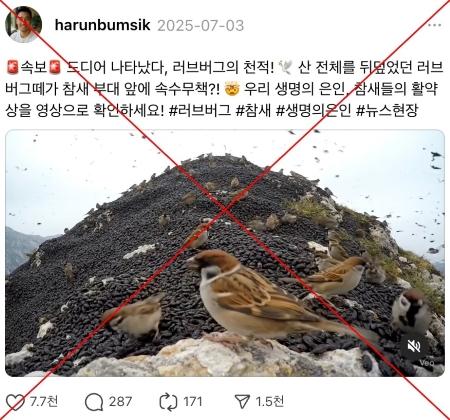 이달 초 수도권을 중심으로 '러브버그'로 불리는 붉은등우단털파리 떼가 출몰하자 한 영상이 참새가 러브버그를 포식하는 모습이라는 주장과 함께 소셜미디어상에 반복적으로 공유됐다. 영상에는 수십 마리의 참새들이 검은색 벌레를 먹고 있는 장면이 담겼다. 일부 언론매체들은 이 영상을 실제인 것처럼 보도하기도 했다. 그러나 이 주장은 사실이 아니다. 해당 영상은 인공지능(AI)으로 생성됐다.