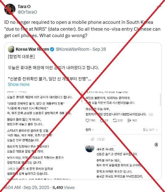 게시글에는 "국정자원관리원(NIRS) 화재로 인해 한국에서 휴대전화 개통 시 신분증이 더 이상 필요하지 않다. 무비자로 입국한 중국인들이 이제 마음대로 휴대전화를 만들 수 있다. 무슨 일이 일어날 수 있을까?"라는 내용이 담겼다.