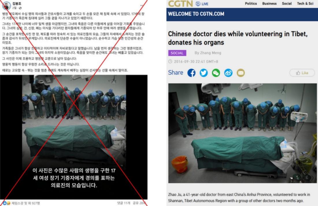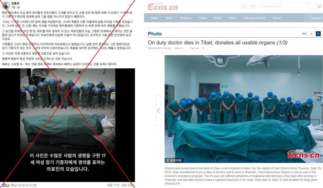 중국 의료진이 동료 의사의 장기 기증에 경의를 표하는 장면을 담은 10여 년 전 사진이 17세 소녀 장기 기증자에게 경의를 표하는 장면이라는 잘못된 주장과 함께 소셜미디어상에 반복적으로 공유됐다. 이 사진은 자원봉사 활동 중 병을 얻고 이후에 사망한 의사에게 동료들이 고개 숙여 인사하는 모습으로 2016년 9월 여러 중국 언론매체를 통해 보도된 바 있다.
