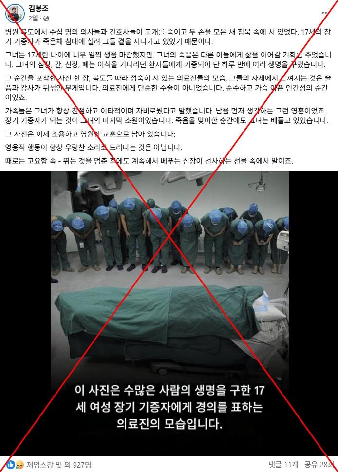 문제 사진은 "수많은 사람의 생명을 구한 17세 여성 장기 기증자에게 경의를 표하는 의료진의 모습"이라는 글귀와 함께 2025년 11월 5일 페이스북에 공유됐다.