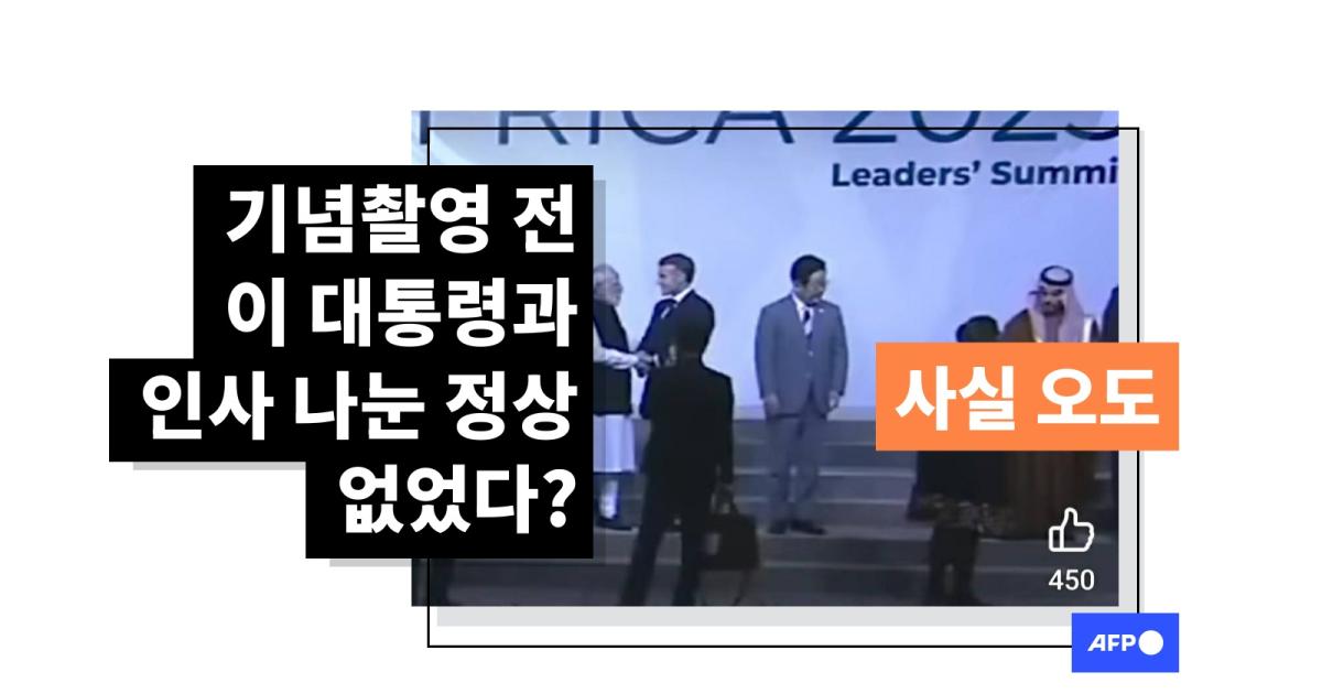 한 영상이 이재명 대통령이 G20 정상회의 기념촬영 당시 다른 정상들에게 소외당하는 모습이라는 주장과 함께 소셜미디어상에 반복적으로 공유됐다. 해당 영상에는 서로 교류 중인 해외 정상들이 가운데 이 대통령만 다소 떨어져 홀로 서있는 듯한 모습이 담겼다. 그러나 이 영상은 특정 장면만 골라 편집한 것으로, 당시 모습을 촬영한 다른 영상에서는 인도의 나렌드라 모디 총리, 다카이치 사나에 일본 총리 등 여러 정상들이 이 대통령에게 다가와 악수를 하고 인사를 나누는 장면이 확인됐다.