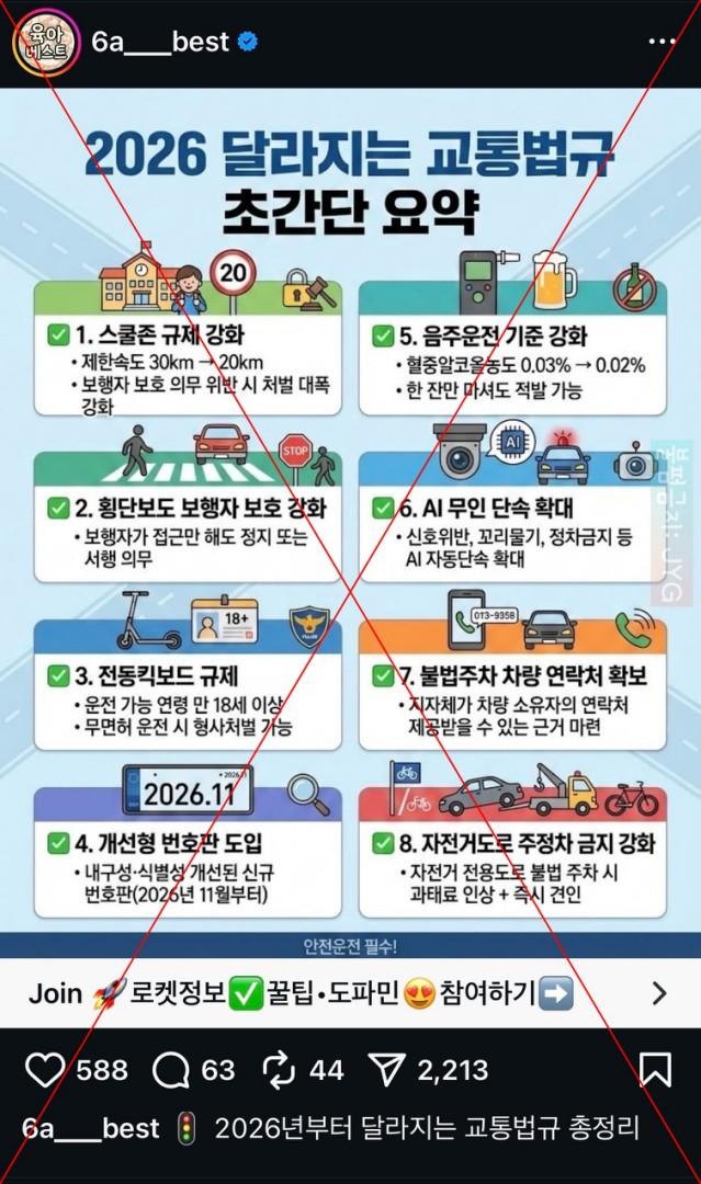 그러나 온라인상에 유포 중인 '2026년 달라지는 교통법규'는 승인된 바도 없고 추진되고 있지도 않다.