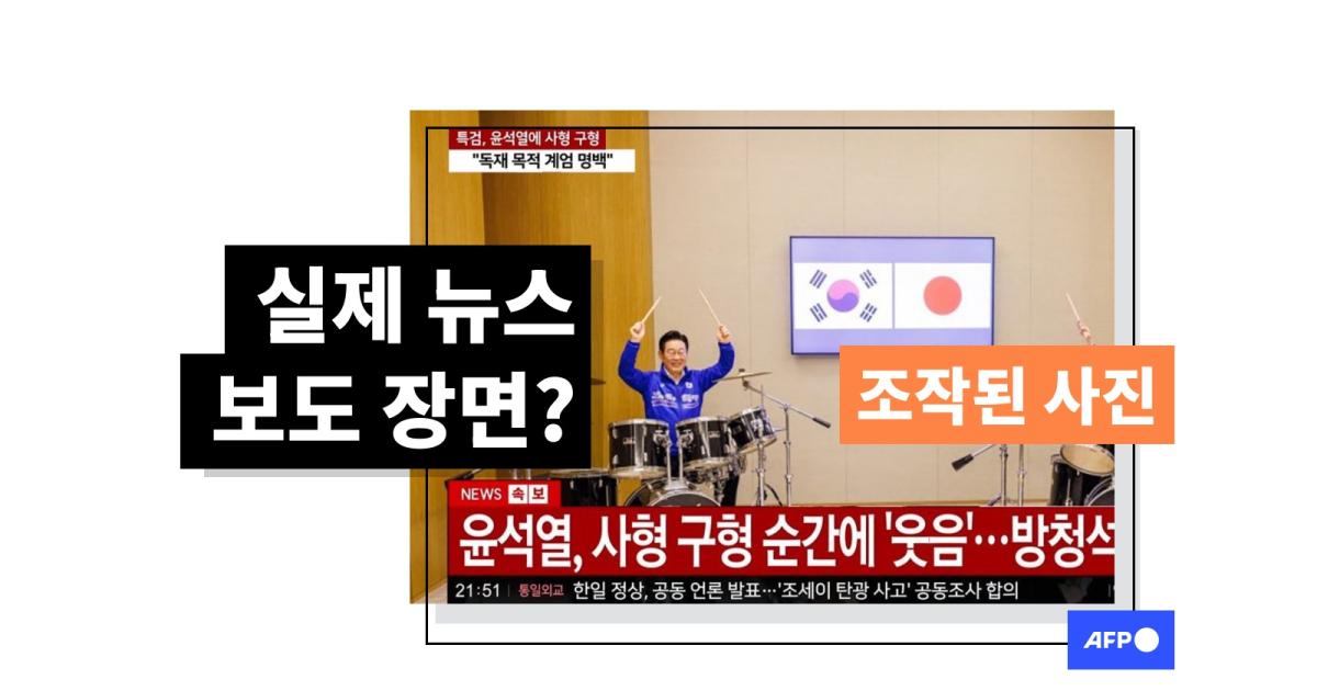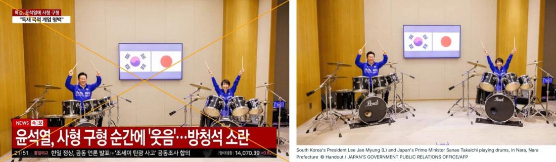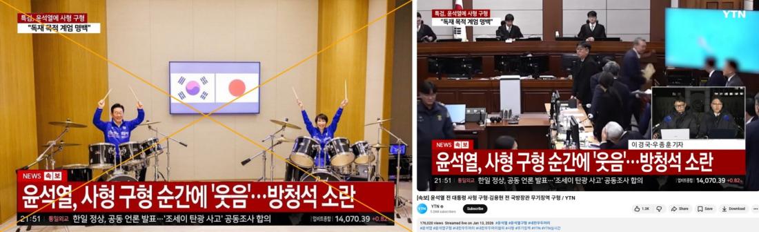 윤석열 전 대통령의 비상계엄 선포 관련 내란혐의 재판에서 사형이 구형됐다는 내용의 속보 자막이 한일 정상의 드럼 합주 사진과 동시에 송출된 것처럼 보이는 장면이 소셜미디어상에 반복적으로 공유됐다. 그러나 이는 드럼 협주 사진에 윤 전 대통령 재판 관련 YTN 속보 자막을 합성한 사진이다. 실제 YTN 보도에서는 해당 자막과 함께 윤 전 대통령 재판 영상이 송출됐다.