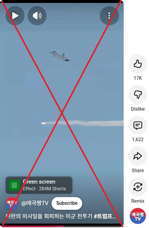 "이란의 미사일을 회피하는 미군 전투기"라는 제목으로 2026년 3월 1일 유튜브에 올라온 약 20초 분량의 영상은 한 전투기가 상공에서 쫓아오는 미사일을 아슬아슬하게 피해 회피 기동을 펼친 후 날아가는 모습을 담고 있다. 50만 명에 가까운 팔로워를 보유한 이 유튜브 계정에서 해당 영상은 4월 초까지 조회수 160만 회를 기록했고, "역시 미국. 넘 멋있다" "최고의 미공군 감동입니다~~" 같은 댓글이 달렸다.