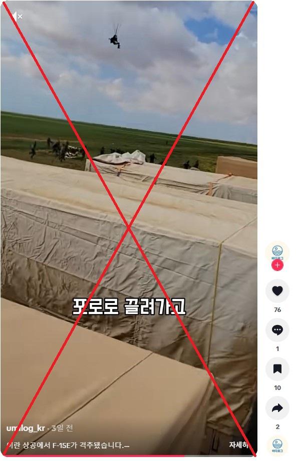 2026년 4월 7일 틱톡에는 "이란 상공에서 F-15E가 격추됐습니다" 라고 시작되는 글과 함께 한 영상이 게시됐다. 해당 영상에는 낙하산을 타고 하늘에서 지상으로 내려오는 인물을 향해 여러 사람들이 달려가는 모습이 담겼다.