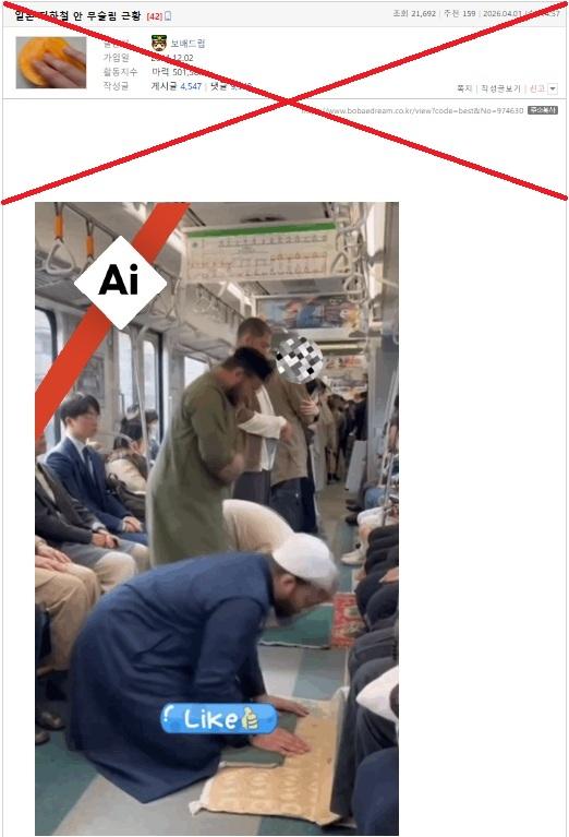 이웃나라 일본에서 반 이민 정서가 확산되고 있는 가운데, 최근 온라인상에서는 이슬람 신자들이 일본 지하철 안에서 단체로 기도를 하는 모습이라고 주장하는 한 영상이 등장했다. 댓글들은 무슬림들이 타국의 문화를 존중하지 않고 타인들에게 민폐를 끼친다고 비난했지만, 사실 해당 장면은 인공지능(AI)으로 생성된 가짜 영상으로, 전문가들은 영상 속의 기도 장면 역시 실제 무슬림들의 기도 방식과 맞지 않는다고 지적했다.