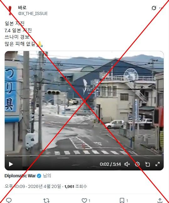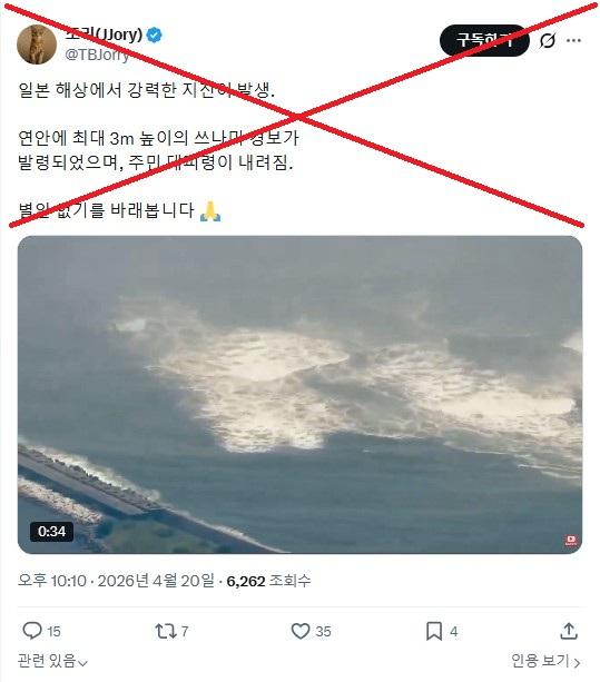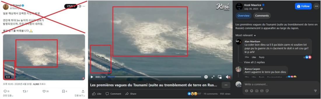2026년 4월 20일 지진과 쓰나미 발생 당일, 한 X (구 트위터) 사용자는 “연안에 최대 3m 높이의 쓰나미 경보가 발령" 되었다는 글과 함께 한 영상을 공유했다. 해당 영상은 높은 파도가 해안 쪽으로 거칠게 밀려오는 모습을 담고 있다.
