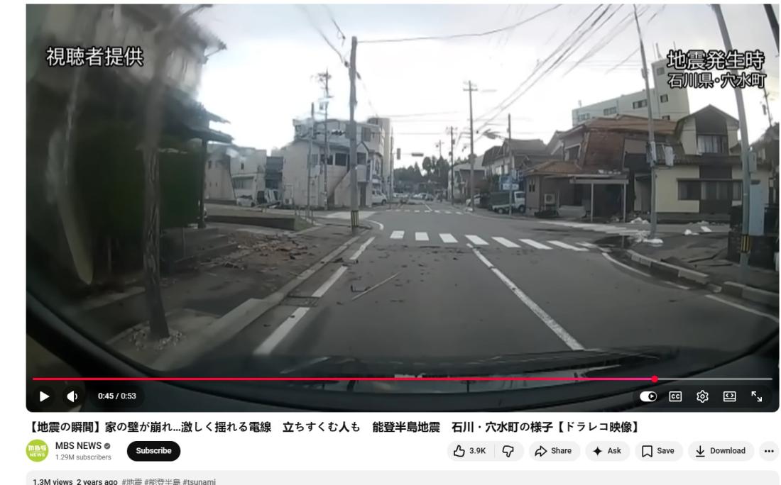 영상 설명에 따르면 이 장면은 2024년 1월 1일 이시카와현 노토반도에서 발생한 노토지진 당시에 촬영됐다 (아카이브 링크).