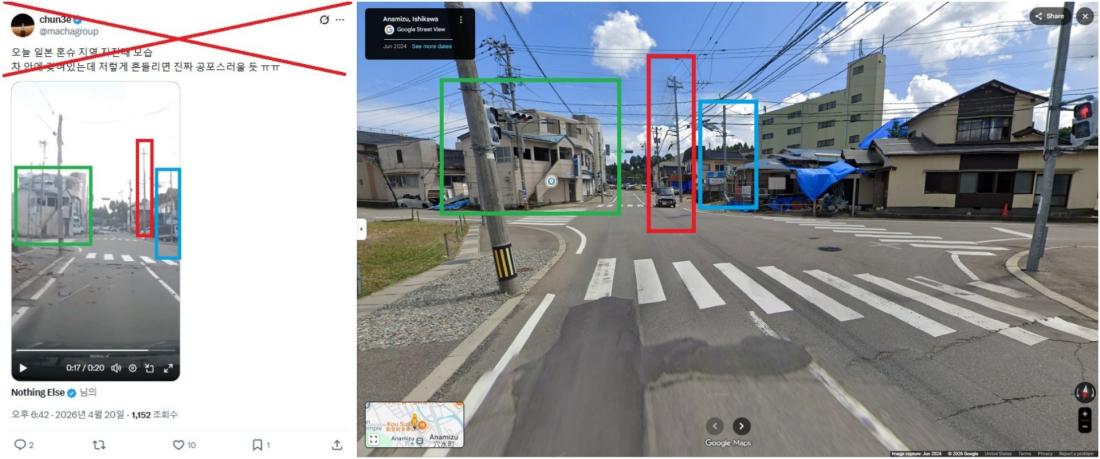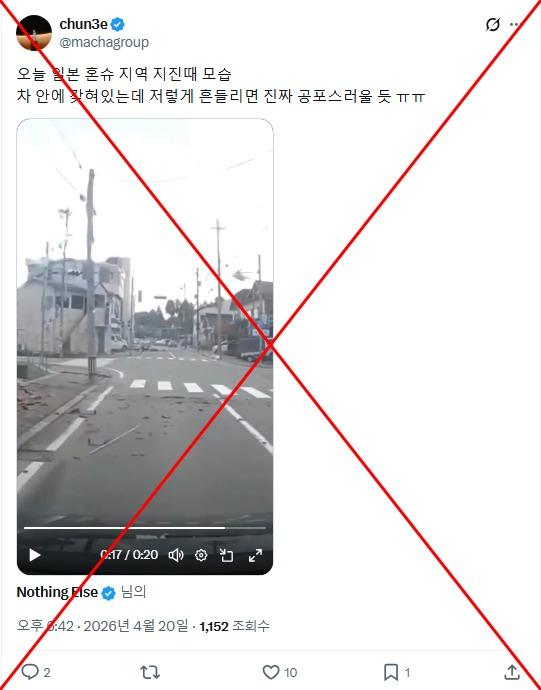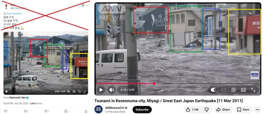 2026년 4월 20일 일본 북동부 지역에서 규모 7.7의 지진이 발생한 직후 지진 현장의 모습을 보여준다는 영상들이 사회관계망서비스(SNS)상에 속속들이 올라오기 시작했다. 하지만 이 영상들은 대부분 과거에 발생한 재해 장면을 담은 것으로, 이번 지진과는 전혀 무관한 것으로 확인됐다. 공유된 영상들은 2025년 일본 동부 연안 지역에서 발생한 쓰나미, 2024년 일본 서부 이시카와 현을 강타한 지진, 그리고 2011년 3월 동일본을 덮친 대지진과 쓰나미 등의 여파를 담은 장면들이었다.