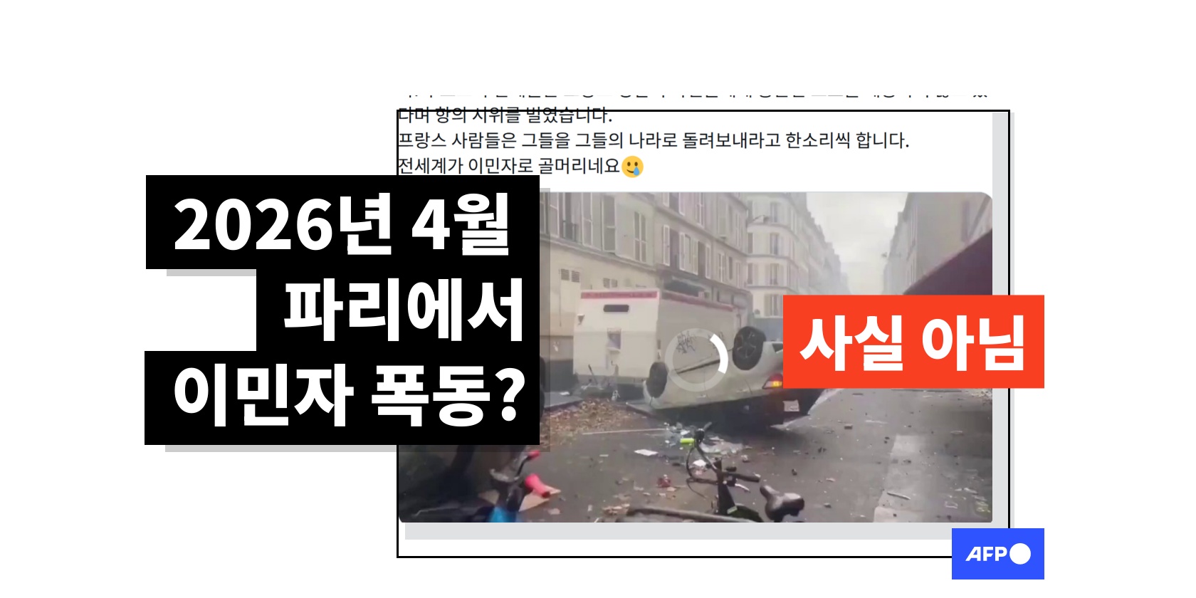 최근 몇십년간 저출산과 급감하는 노동력 문제를 해결하기 위해 한국은 많은 이주 노동자와 이민자를 받아들여 왔다. 그러나 이러한 변화 속에서 이주민 전반에 대한 거부감과 혐오가 확산되기도 했는데, 이러한 정서를 반영하듯 SNS상에서는 최근 프랑스에서 이민자들에 의한 폭동이 일어나 파리가 혼란에 빠졌다는 영상이 등장했다. 그러나 파리 현지 경찰은 "최근 몇 달간 파리에서 그런 (폭력적인) 시위는 발생한 적이 없다"고 못 박았고, AFP의 확인 결과 해당 영상은 2022년 파리에서 외국인 혐오자가 쿠르드인 3명을 총기로 살해한 이후 벌어졌던 4년 전 시위 장면이었다.