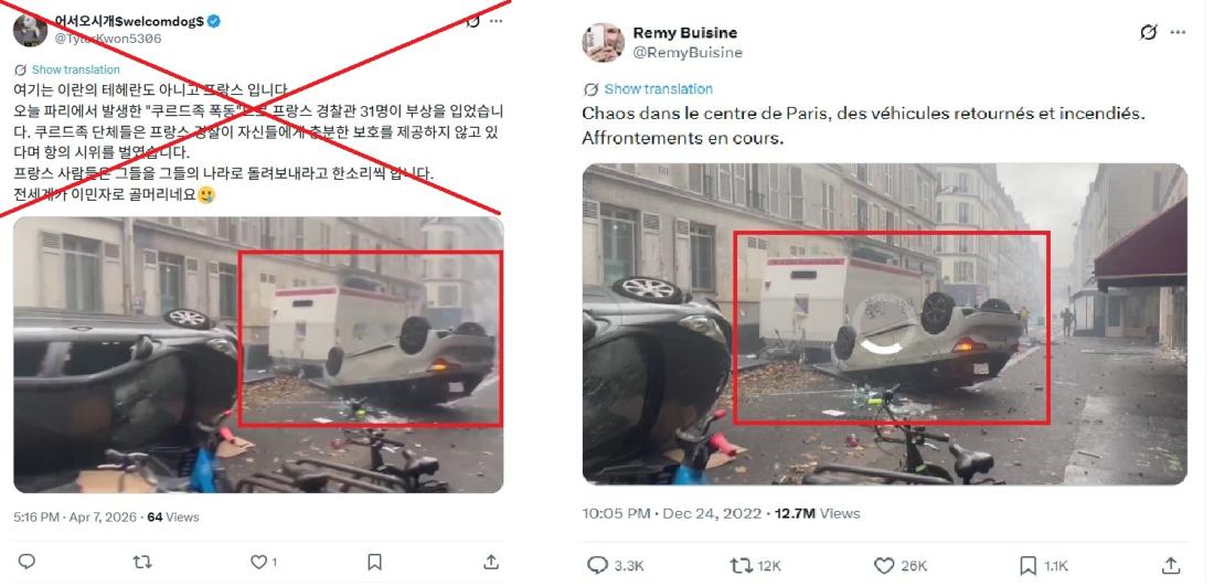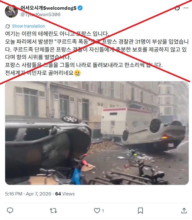 2026년 4월 7일, 한 X (구 트위터) 이용자는 "오늘 파리에서 발생한 "쿠르드족 폭동" 으로 프랑스 경찰관 31명이 부상을 입었습니다"라고 주장하며 한 영상을 함께 공유했다.