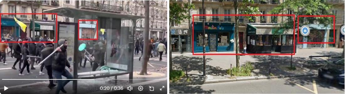 두 웹사이트는 해당 영상의 출처를 문의하는 AFP 문의에 답을 하지 않았다. 하지만 구글 스트리트 뷰를 통해 해당 영상에 나오는 버스 정류장은 실제로 2022년 당시 시위가 있었던 레퓌블리크 광장 근처에 있는 오베르캉프- 피유 뒤 칼베르 버스 정류장임을 확인할 수 있었다 (아카이브 링크).