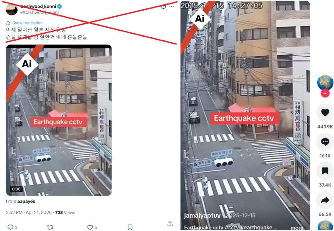 2026년 4월 20일 일본 북동부에서 규모 7.7의 지진이 발생한 이후, 피해 현장의 모습을 생생하게 담았다는 영상들이 사회관계망서비스(SNS)상에 속속들이 등장했다. 그중 하나는 일본 거리의 건물과 전력선이 좌우로 심하게 흔들리는 장면을 담은 CCTV 영상이라는 설명과 함께 널리 확산됐지만, AFP 확인 결과 해당 장면은 인공지능(AI)으로 생성된 영상으로 밝혀졌다.