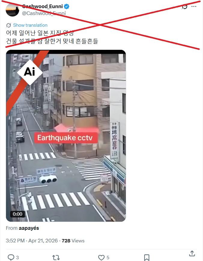 일본 이와테현 인근에서 지진과 쓰나미가 발생한 다음 날인 2026년 4월 21일, 한 X(구 트위터) 이용자는 “어제 일어난 일본 지진 영상”이라는 글과 함께 한 영상을 공유했다. 방범 카메라(CCTV)로 촬영된 것처럼 보이는 이 영상에는 도심의 한 교차로를 둘러싸고 있는 고층 건물들이 약 15초간 좌우로 크게 흔들리는 장면이 담겨 있었다.